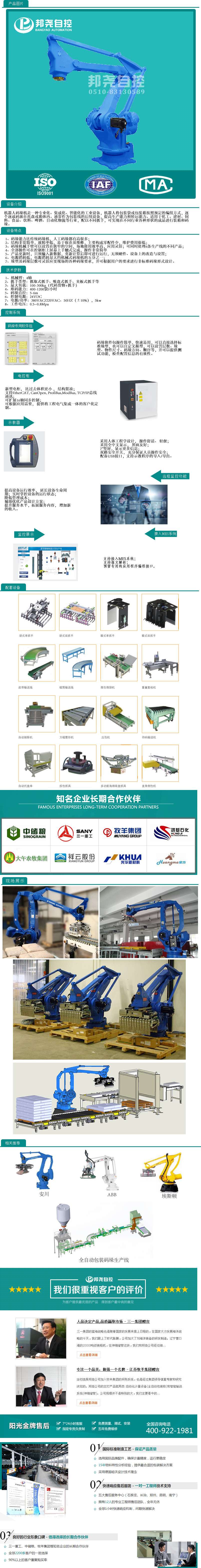 無錫邦堯自控技術有限公司15年來一直專注于物料的自動稱重和輸送工程,產品橫跨飼料,面粉,肥料,精細化工和建筑材料等行業,針對這些行業要求自動碼垛速度快(碼垛速度最快要求達到1200包/時),現場粉塵大,要求售后服務反應迅速這些特點,與安川機器人達成戰略合作伙伴關系,針對袋裝物料自動碼垛這個細分市場,做了詳細的產品細節改進和技術分析,專一為用戶提供物料從自動稱重,整形,金屬檢測,復檢稱,自動噴碼,自動碼垛到纏繞膜包裝這一站式解決方案.